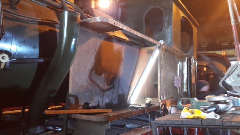 After that, a coal chute was fabricated. The inclined plate is designed to cause the coal to slide gradually and automatically towards the cab as coal is shovelled from the feed plate.