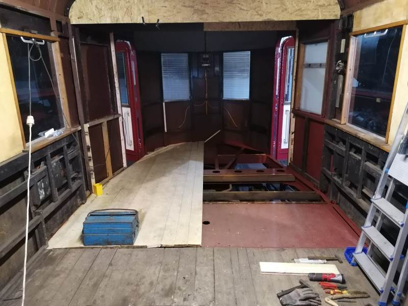 Woodwork is also being carried out in our rail car trailer VB 197 805. After the corrosion protection has been applied to the frame of the vehicle, a wooden floor will be fitted. After that, the interior walls and the toilet can be installed again. Finally, linoleum will be installed as floor covering.