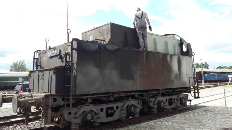 Repainting the tender of our steam locomotive 50 3700 (we reported last week) made progress, too. Here, we were able to repaint the coal bunker and the water tank on the left side.