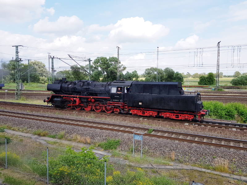 But one thing at a time: On the Friday before the event, the vehicles were arranged as usual, the steam locomotives were fired up and this time the necessary ground markings and guidance systems were also installed in order to organize a regulated visitor traffic with sodial distancing. In addition, 50 3570 was sent to the port of Wittenberge for a trial run to see if the work we had carried out on the runnung gear recently had been successful. The trip was completed without incident and the following photo shows the locomotive on its way to the harbour