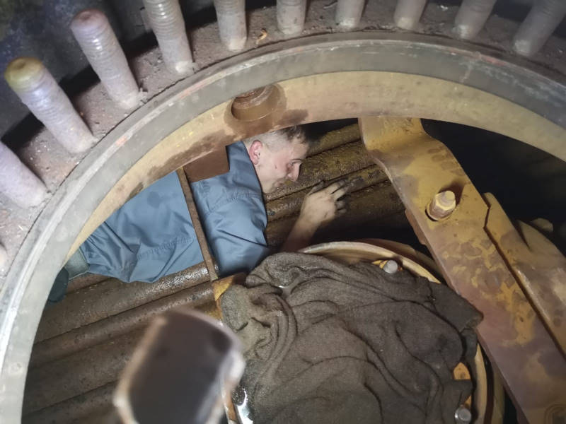 In the process, rare views from the inside of the boiler can be seen. The following picture shows the so-called ceiling anchors. These are the long metal rods to which the firebox is attached inside the boiler.