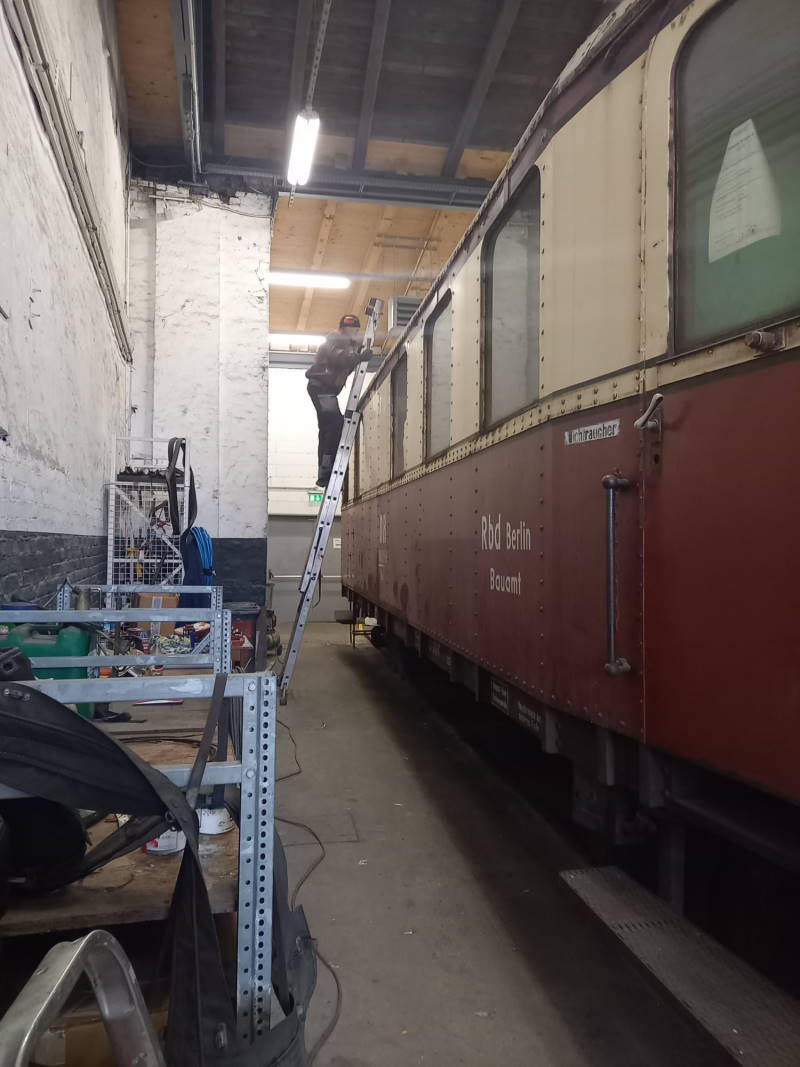 Work on the 190 851 sidecar is now to be intensified. After the diesel locomotive 102 076 moved out of our repair hall, the car could be brought here. In the next weeks and months, its outer skin will be completely refurbished.