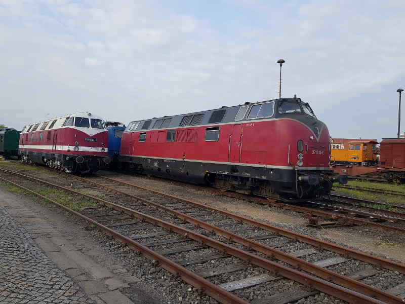 In addition, the railroad company Potsdam contributed some exhibits for the locomotive exhibition in the outdoor area. Many thanks again for that! In the following picture, you can see the diesel locomotive 221 145 of the former Deutsche Bundesbahn in dark red livery next to its sister 118 692 of the Deutsche Reichsbahn.