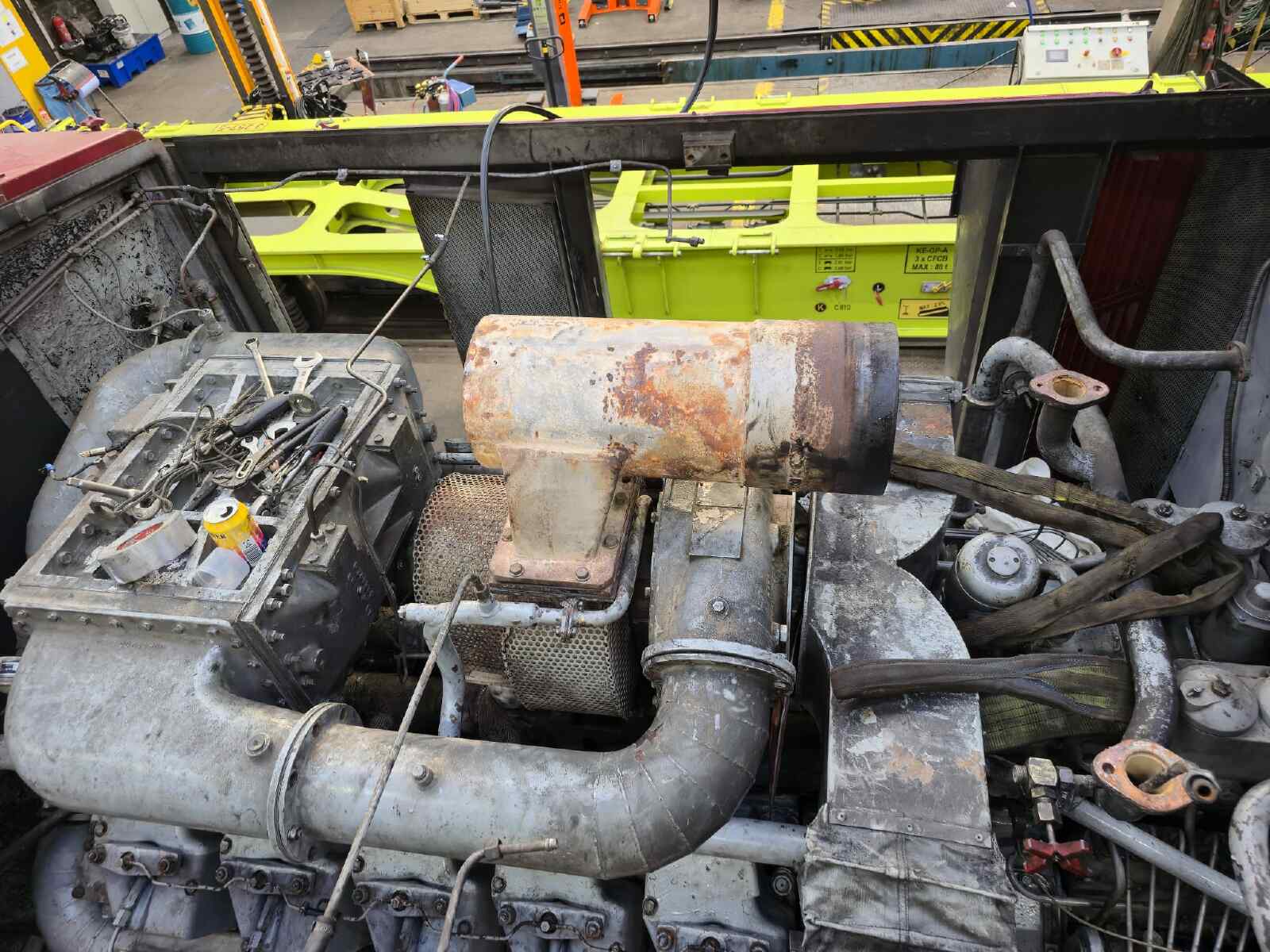 Although our engine had only run for a few dozen operating hours since its last major overhaul a few years ago, leaks had developed in the turbocharger during the long period of inactivity since the locomotive was taken out of service by its last commercial owner. These leaks had to be repaired before we can put the locomotive back into service. To do this, the turbocharger and various other attachments were removed from the engine compartment so that they could be reconditioned.