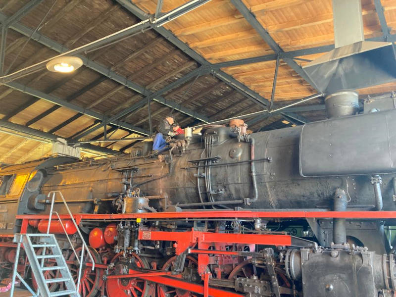 Then the locomotive was driven back to the shed and the boiler was washed out. This is necessary from time to time because the lime contained in the boiler water settles on the walls and pipes in the boiler and can cause damage if the deposits become too thick. This is why the boilers of our steam locomotives have to be flushed with high pressure.