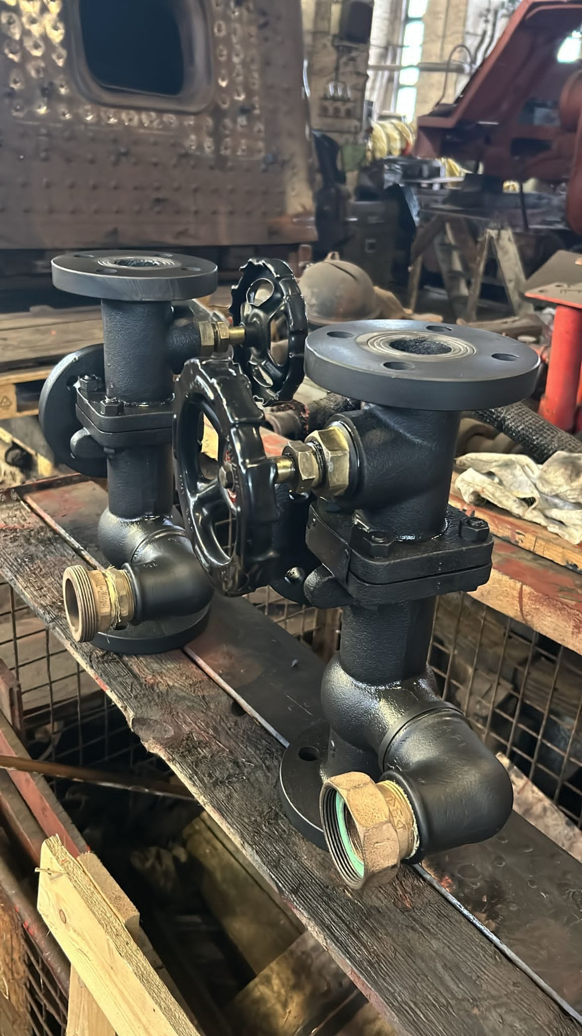 We also removed the drain valves and safety valves from the drive cylinders. One is used to drain condensation in the steam cylinders. The others are for emergency draining if too much condensation has collected in the cylinders and the movement of the pistons presses so hard against the cylinder covers that they could burst. It is well known that water cannot be compressed.