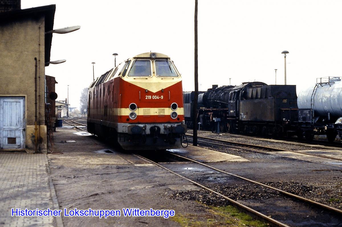 ![]() 30 years of Dampflokfreunde Salzwedel e.V. - Memories On the occasion of our Autumn Steam 2014 event, several diesel locomotives of different classes also gathered in the historic locomotive shed in Wittenberge. The picture shows, from left to right, our diesel locomotive 118 692, MEG class 119 locomotive 301, diesel locomotive 204 774 (now our property) and an MEG class 218 diesel locomotive. |