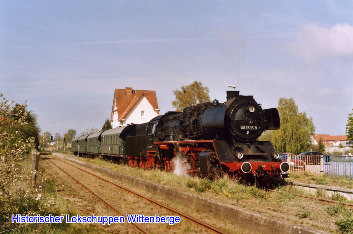 ![]() 30 years of Dampflokfreunde Salzwedel - Memories On 25 April 2004 we celebrated our 10th anniversary. This was reason enough to invite a few guest locomotives to Salzwedel and run them in front of special trains. The following picture shows the steam locomotive 50 3695 of the Staßfurt railway friends with wagons of the Arbeitsgemeinschaft Verkehrsfreunde Lüneburg (AVL) in Arendsee. |