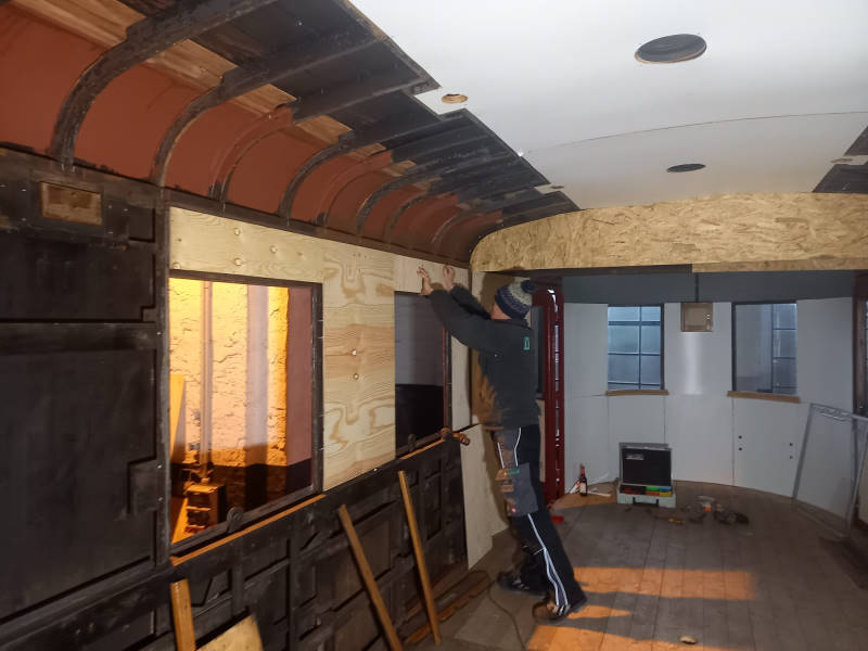As mentioned above, work is also being done on the 197 805 trailer car. Here, the interior work is progressing. In the last few days, the new wooden wall panels were installed.