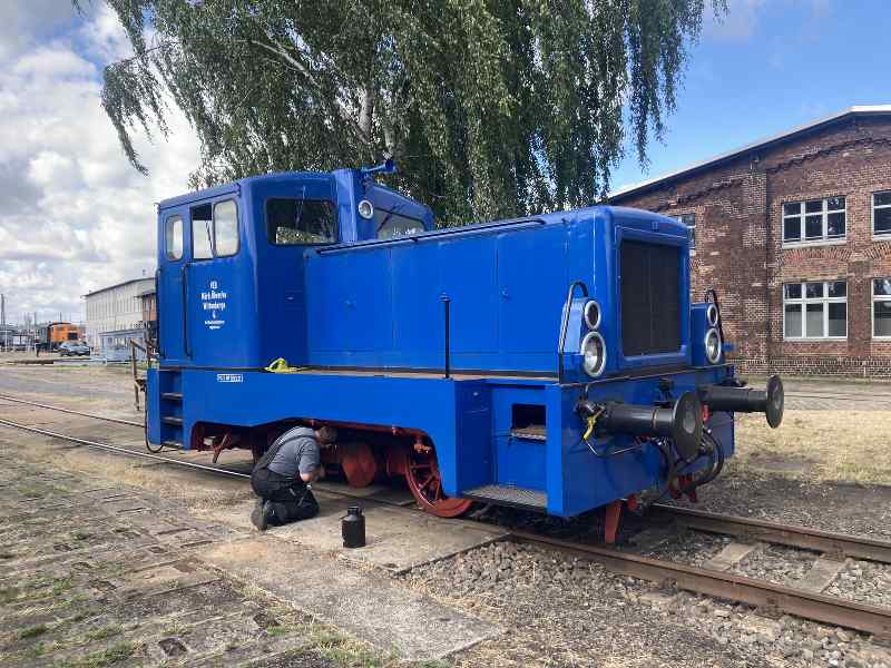 Last weekend, our traditional summer festival took place at the Historic Engine Shed in Wittenberge. We had already started with the preparations on the Thursday before. First of all, we had to prepare our operational vehicles for their use. This included cleaning some locomotives, heating up steam locomotives, greasing diesel locomotives, some shunting work and, of course, preparing the catering. Here are some pictures.