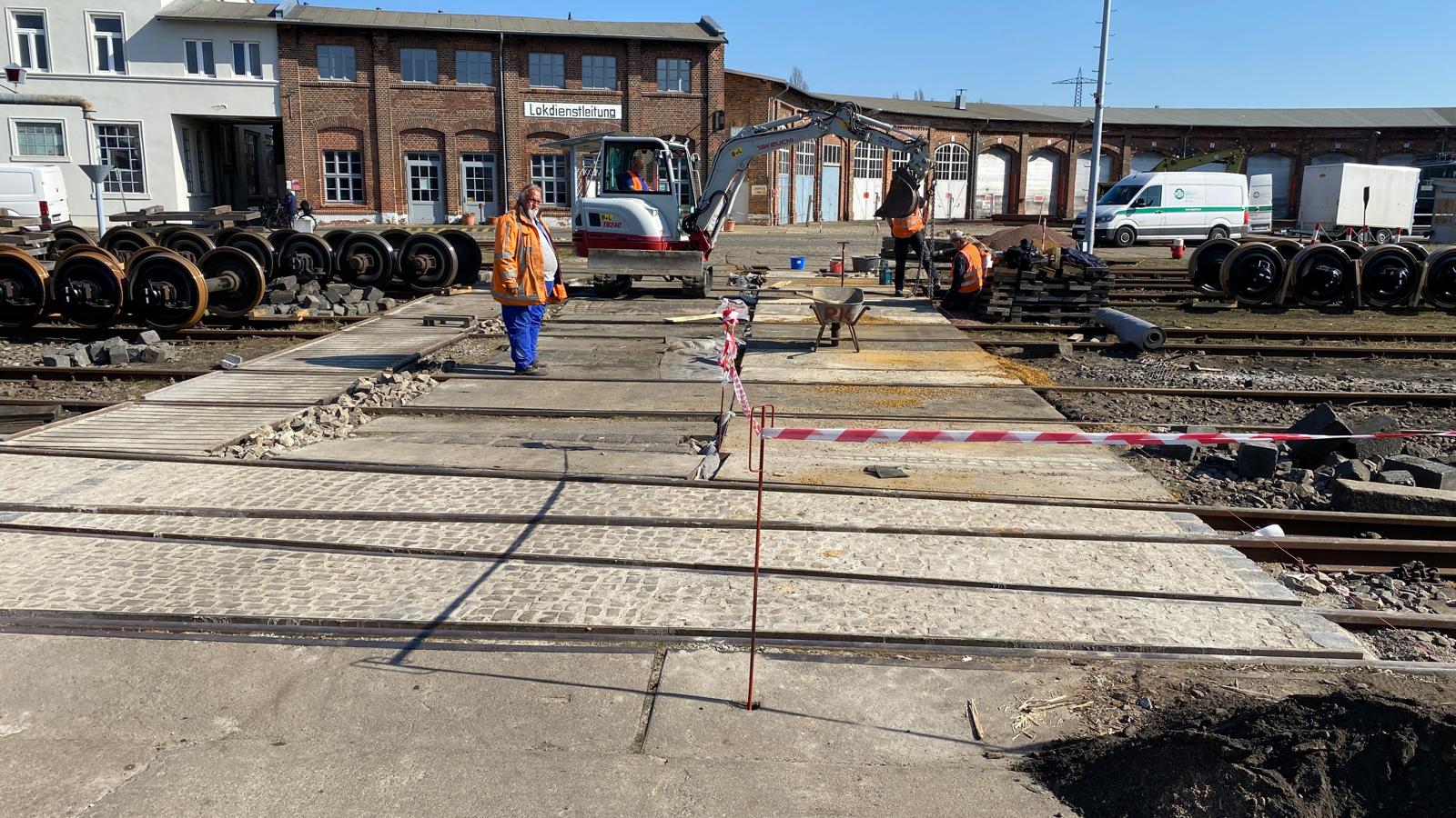 Zum Thema Sicherheit trägt auch die Neugestaltung des Bahnüberganges bei, der vom Pförtnergebäude zum Lokschuppen führt. Wir bemühen uns, die Pflasterarbeiten bis zum Ostersamstag abzuschließen, damit Sie das Museum bequem erreichen können.