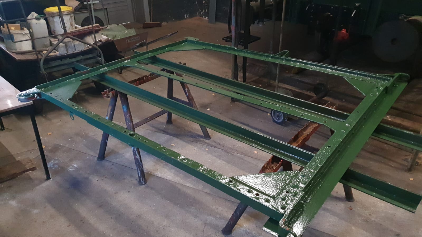 Work on the tender also continues. Now that all the metal work on the inside of the tender has been completed, we can turn our attention to coating the water tank. It has a capacity of 26 cubic metres. We applied a special paint to prevent or at least slow down further corrosion. Below is a picture of the inside of the tender. Here you can see that it has partition walls with a number of more or less large openings. These walls are intended to prevent the water inside from sloshing around too much when the locomotive accelerates or brakes.
