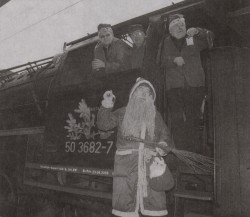 von Nico BindeEine Sinfonie in Schwarz, Rot und Weiß: Farblich bestens aufeinander abgestimmt waren am Sonnabend der Nikolaus (Dennis Alexander Berg) und die Schwarze Lady im Hintergrund. Auch Markus Goebel (links) und Lukas Rasmus staunten nicht schlecht, als aus dem Wagen, der hinter die Dampflok gespannt war, ein Mann mit rotem Umhang und Rute stieg. Sie hatten allerdings weniger Augen für die farbliche Abstimmung. Sie interessierte vielmehr, was der Nikolaus in seinem Sack hatte. Um es vorweg zu nehmen: Es waren Gummibärchen. Lukas ist übrigens echter Eisenbahnfan. Beim Einfahren der Lok referierte er über Baujahr und Typ-Nummer.